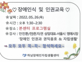 센터공지사항 2022년 05월 26일(목) 장애인식 및 인권교육 많은 참석 바랍니다