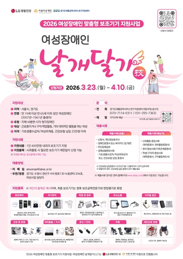 이번 사업은 근로·구직·학업 등 사회활동을 하거나 이를 병행하며 자녀를 양육하는 서울·경기 지역 거주 만 19세 이상 65세 이하 여성장애인 20명을 대상으로, 1인당 최대 400만 원 내외의 맞춤형 보조기기를 지원한다.