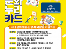 | 112 |  | 취약계층 문화향유 기회 ‘문화누리카드’ 올해부터 15만원 지원 | 관리자 | 81 | 2026년 2월 2일 |